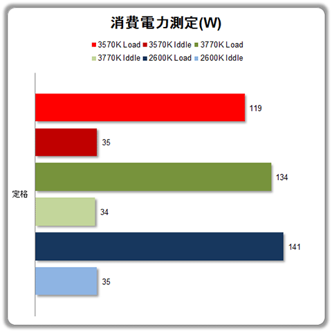 2600Kと3770Kの消費電力は、3770Kが若干低いか、ほぼ同程度ていどに収まっています。これは、シュリンクの関係からすると、もうちょっと消費電力は落ちて欲しかったと思えますが、周波数が0.1GHz増加していることを考えると、こんなもんかな?とも思えてきます。さすが3570Kは低消費電力性能は素晴らしく、2600K/3770Kを15W~20Wと大きく引き離しています。
