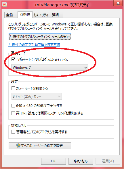 ⇒アプリがWindows7用なので、「互換モード」を試すことに。