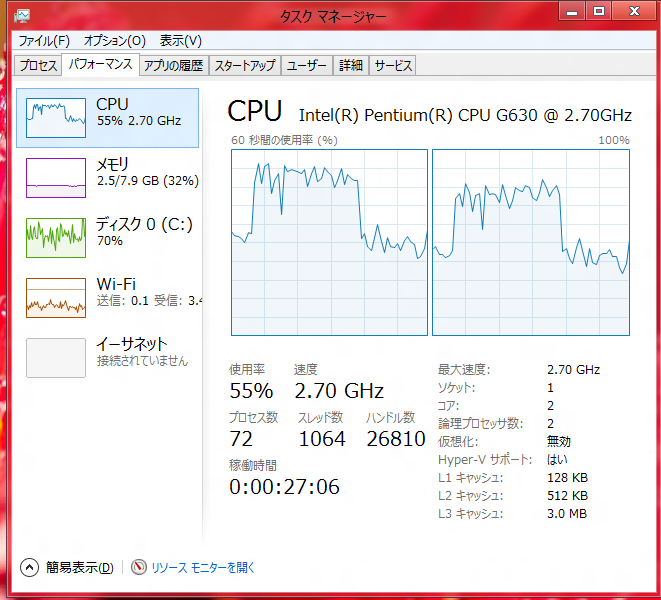 ・G630の時は1番組再生・録画しただけで、50%以上CPUを使っていたのですが、