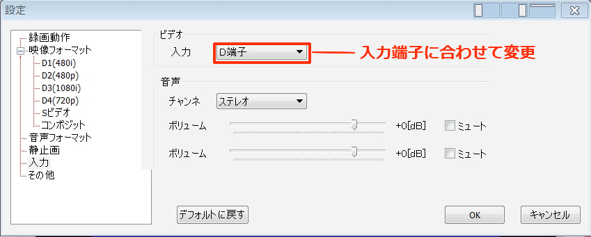 また、RCA、S端子、D端子を切り替えるにはキャプチャ側の設定変更が必要。
