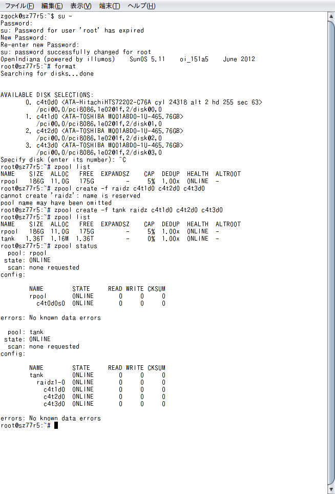 起動後、500GBのHDD3台をraid-z構成のzpoolに設定します。