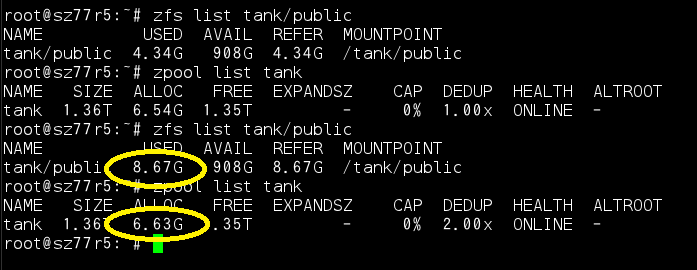 すると、zfs領域であるtank/publicの使用量は2倍の8GBになっていますが、