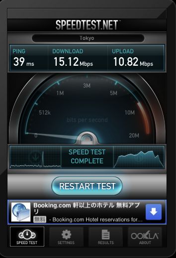 まずはルーターとしてですが、802.11b/g/n、300Mbps通信(2×2のMIMO+デュアルバンド)、WPSに対応しています。現状450Mbps以上の無線子機が少ない状況を考えると300Mbpsは妥当だと思いますが、干渉の少ない5GHz帯の802.11nにも対応して欲しかったです。上位機種のWN-AG450DGRは5GHz帯対応で別途USBチューナを購入すれば本機と同じような使い方ができるので、差別化しているのかもしれません。SpeedTestというiOS用のアプリで速度測定したら、Downloadが15Mbps、Uploadが10Mbpsくらいでした。速度的には全く問題ありません。