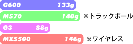 同じゲーミングマウスのG3と比べると45gも重く、ワイヤレスマウスのMX5500付属マウス(MX-R同等品)より13g軽い感じです。