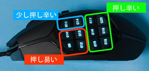 - マウスを持つ手に力が入るタイプの方だと、サムボタンを押す際にGシフトボタンを誤クリックしてしまうかもしれないですね。