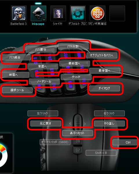 ロジクールの左手用ゲーミングボード G13 がイラスト作成に役立つというレビューも見かけるので、G600に煩わしいショートカット操作を登録して楽したい!