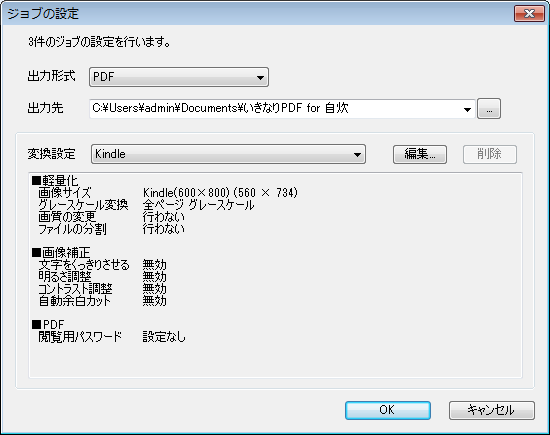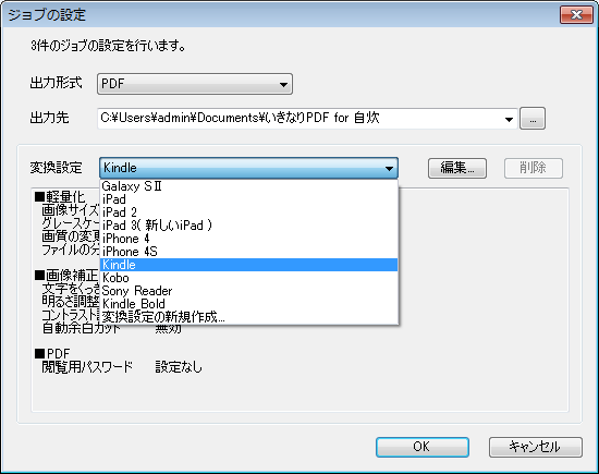 ウインドウにファイルをドロップするとジョブの設定画面が現れますので、ここで変換設定を行います。最初から各種ブックリーダー用の設定がありますが、これは各ブックリーダーの画面サイズに合わせたものです。