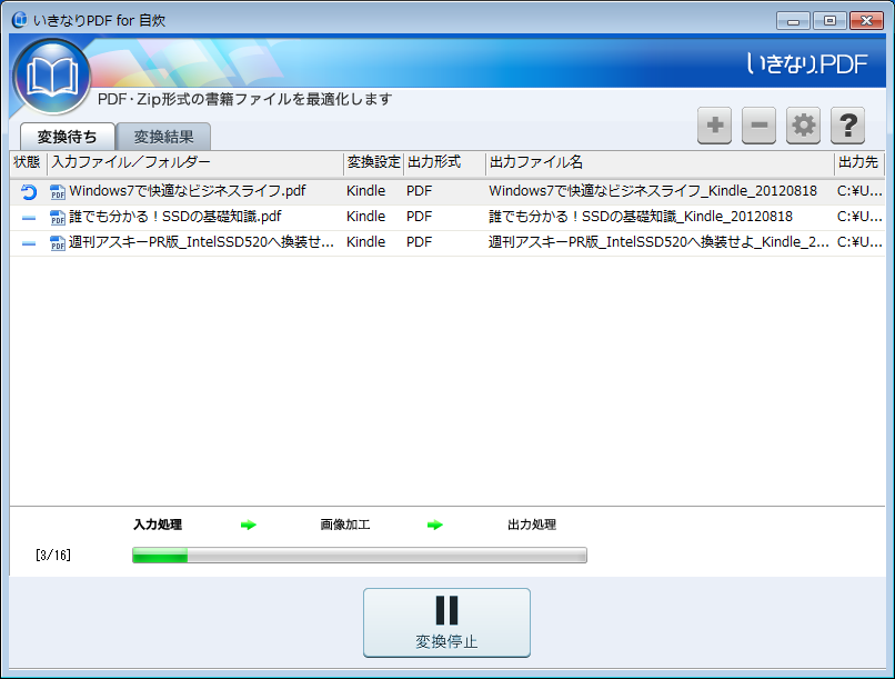 ここで言う自炊というのは、自宅でご飯を作ることではなく、スキャナを使って自分で電子書籍を作ることです。ただ、300dpiや600dpiなど印刷にも耐えるような解像度でスキャンすると電子ブックリーダーで見るには向かないデータができてしまいます。具体的にはデータサイズが大きすぎてページの表示に時間がかかるんですね。そこで「いきなりPDF for 自炊」の出番です。電子ブックで扱いやすいデータに変換してくれます。