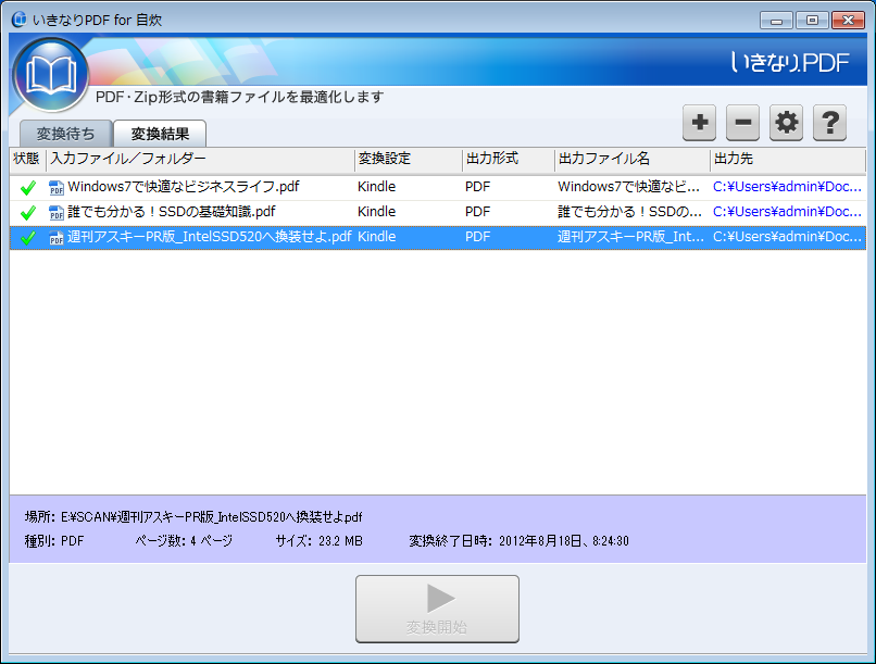 使う前は「jpegファイルを登録して、順番とか決めて、変換」ってやるんだろうなあと思っていたのですが、良い意味で裏切られました。ドキュメントスキャナに付属しているソフトだとpdfを作ってくれるものが多いのでpdfファイルから変換できるのは便利ですね。