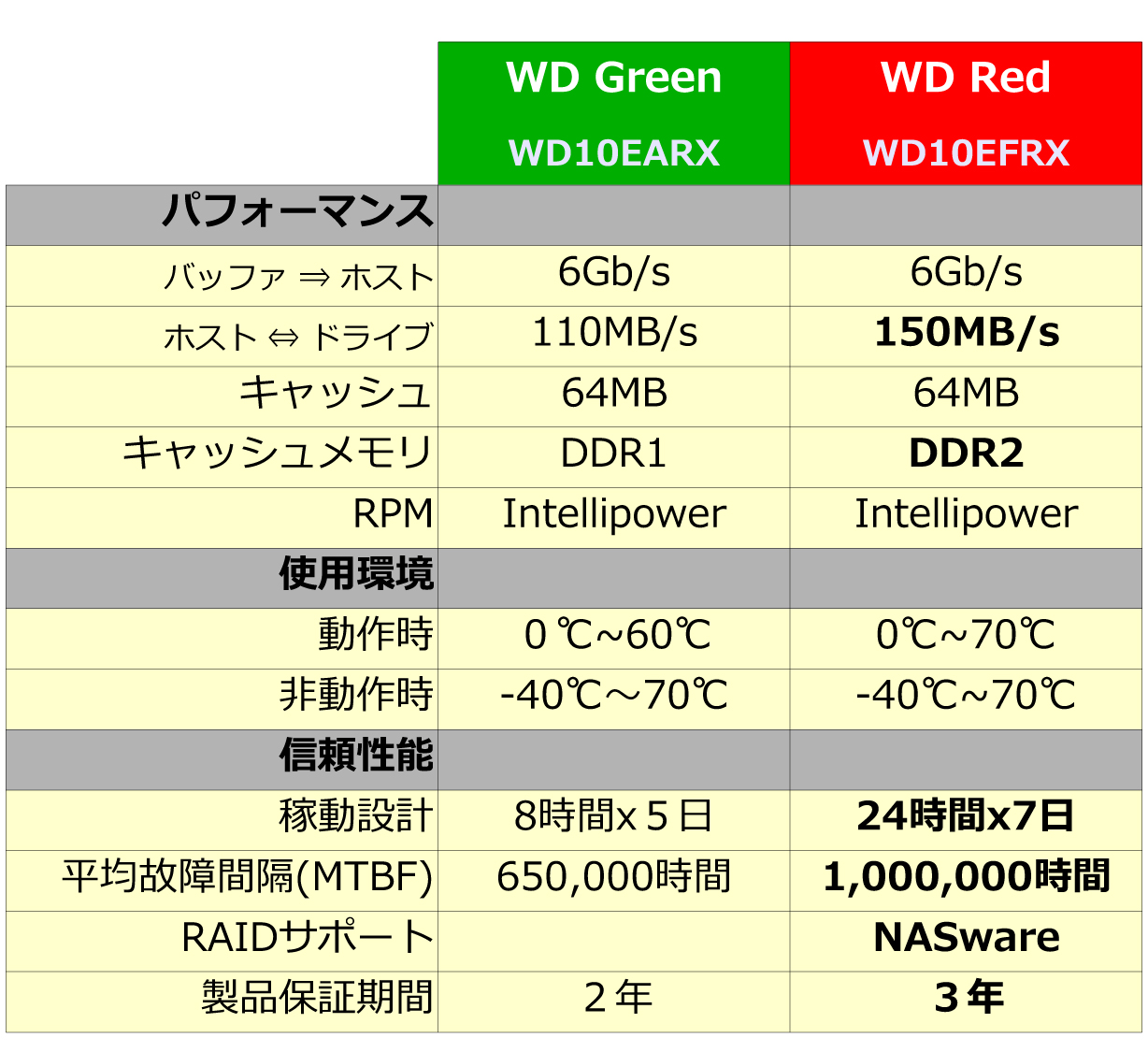 WD Greenと WD Redの性能の違いが分からず、ググって調べてみました。