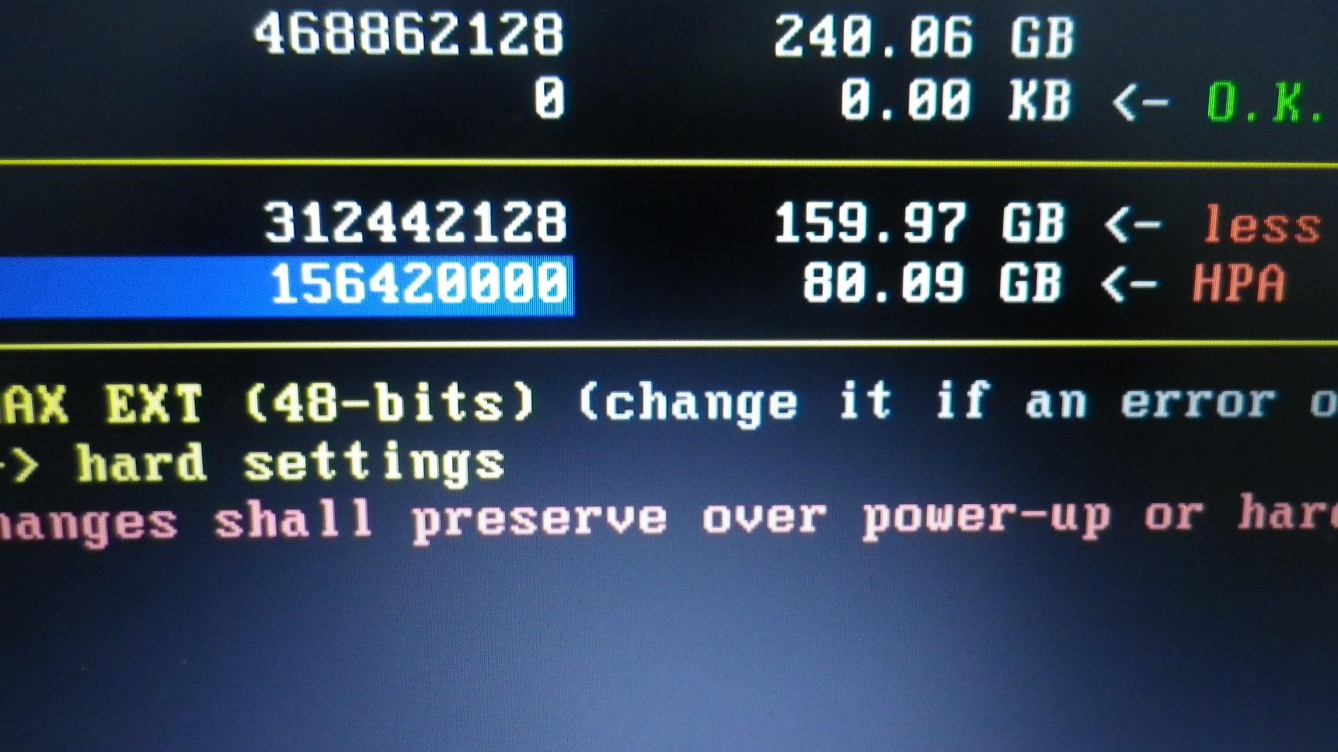 そしてSキーを押すと設定を保存するかしないかをY/Nで聞かれるのでYを入力.その後,ESCキーをおしておしておして戻る.そして再起動してオーバープロビジョニングの設定は終わりです.以下の画像をみてわかるように容量が223GBから約80GB減っているのがわかります.