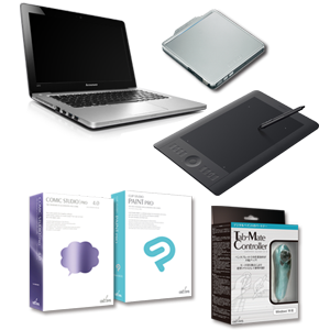 「クリエイターデビューセット with Ultrabook™」は、これからクリエイターを目指す人や今まで手描きで作品を制作してきたクリエイターの人たちに、「Ultrabook™ Lenovo IdeaPad U310」を初め、イラスト制作ソフト「CLIP STUDIO PAINT PRO」、マンガ制作ソフト「ComicStudioPro 4.0」、デジタルペイントのパートナー「Tab-Mate Controller」、ペンタブレット「Intuos5 medium」、USB-2.0 DVDドライブ「DVSM-PC58U2V-SV」をセットにしたパッケージです。