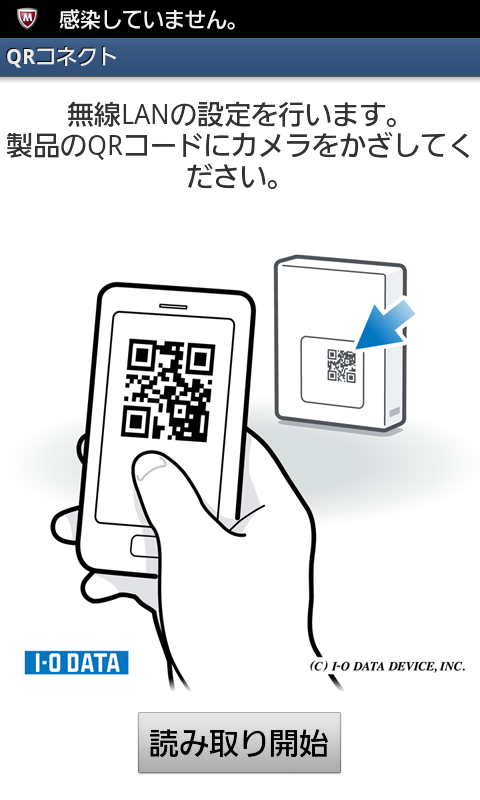 QR読み込み画面になるのでWNHD-U500のQRにスマートフォンをかざします。