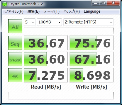 旧ファイルサーバ(HDL-GX300)はUPもDOWNも11MB/sぐらいだったので、だいぶ速くなりました。