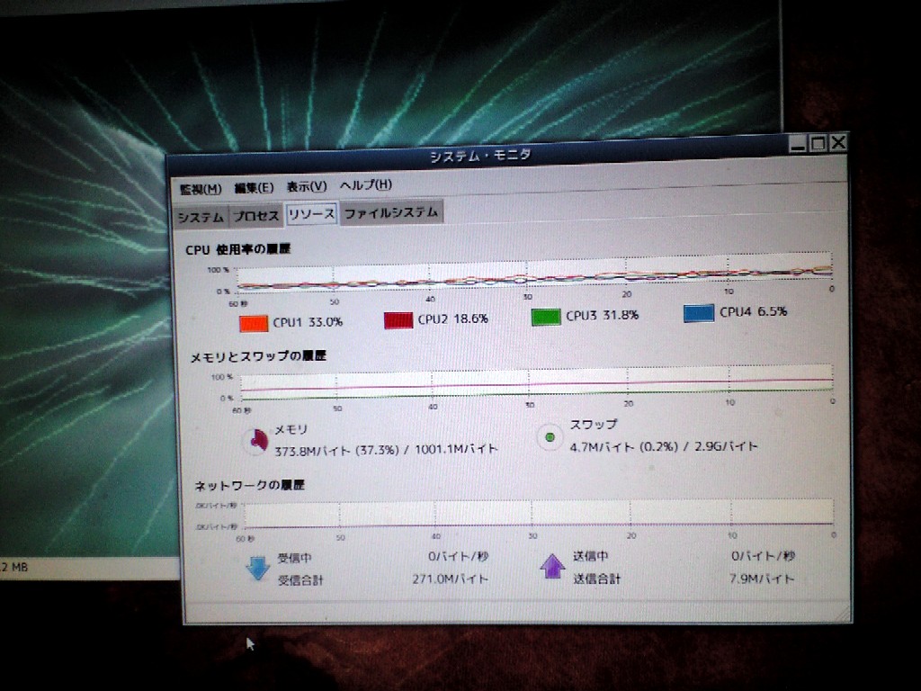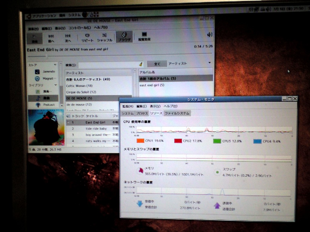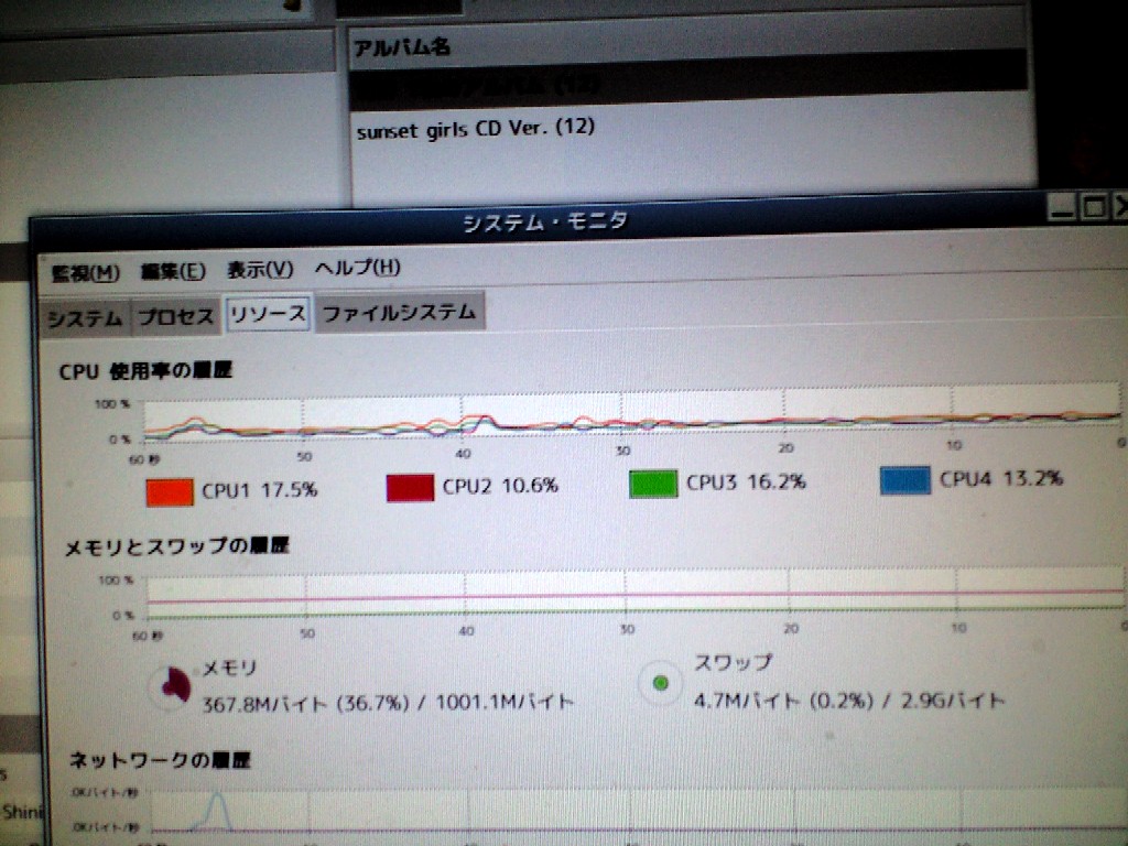 仕方なく、システムモニタを表示、再生ソフト(songbird)動作時の