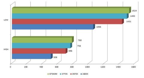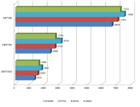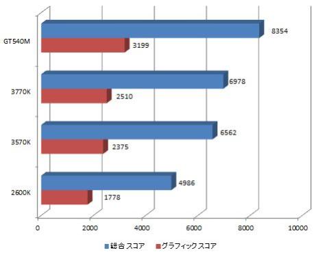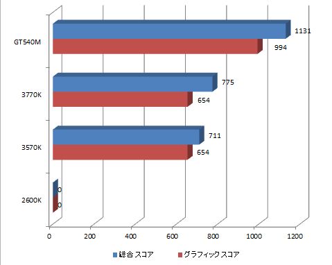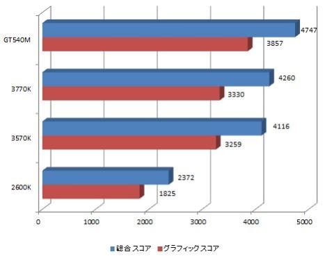 3570KのスコアではGT540Mに一歩及ばないスコアだったのですが、3770Kでは上回っています。このような結果の原因は、おそらくこのベンチマークがCPU側のスコアを3D Markよりも重視しているからではないのでしょうか。と、勝手な推測。