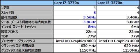 Core i7-3770KとCore i5-3570Kの違いは動作周波数、キャッシュ容量、Hyper-Threadingの有無です。