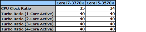 どちらも倍率変更可能なCPUなのでターボ・ブースト時の動作倍率をBIOSから下表のように設定して1コアにだけ高負荷が掛かった時も、4コア全てに高負荷が掛かっている時も常に4.0GHzまで動作周波数が上がるオーバークロック状態でも同様のベンチマークをしました。