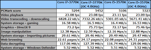 テスト項目ごとの結果を見るとVideo transcoding - downscalingはHTありのCore i7-3770Kが有利ですが、Graphics - DirectX 9、Image manipulation、Web browsing、Data decryptingでは動作クロックの高いほうが有利となり総合的には最初に書いたような順番になったようです。