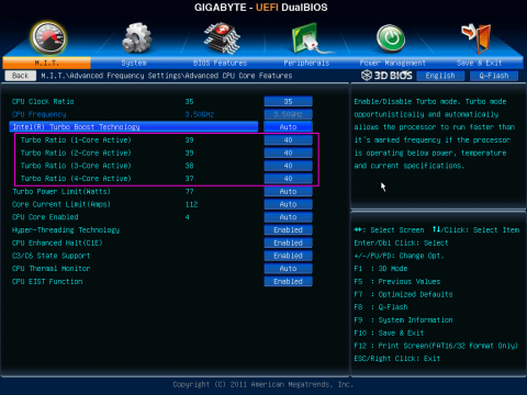 BIOS画面で確認したターボ・ブースト時のデフォルト倍率は下表のとおりです。