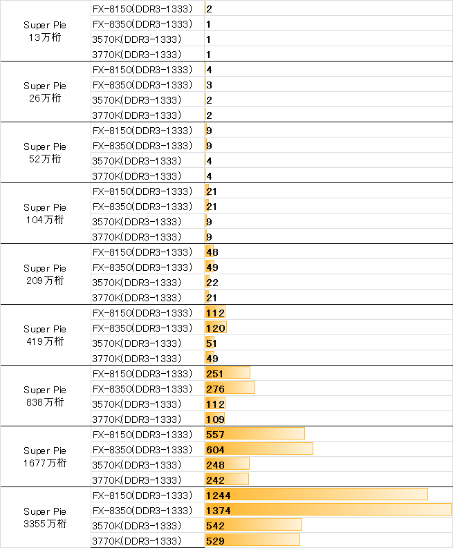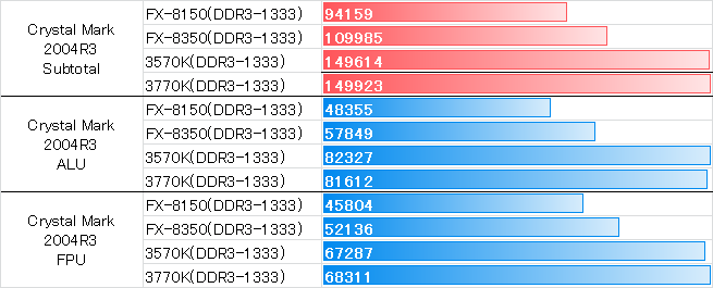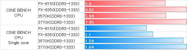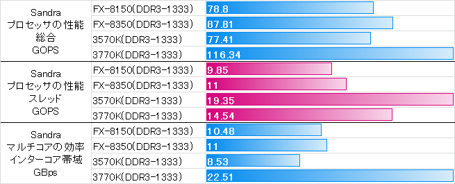 Sandraと同様にシングルとインターコア帯域でFX-8350を圧倒的に突き放しているにも関わらず、トータルでFX-8350との差があまり開かないのはそのあたりに原因がありそうです。