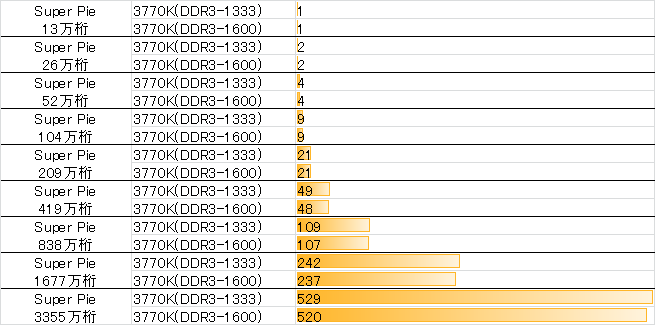 CoreTM i5 3570KではSuperPieの3355万桁で11秒短縮するなど、CPUへの影響も見られましたが、CoreTM i7 3770Kではメモリの影響はちぃともないようですね。