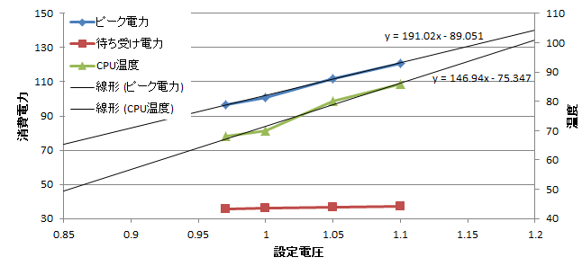 今回は1.1V(定格)、1.05V、1.0V、0.97Vの4点を測定し、グラフ上で近似式を出しました。