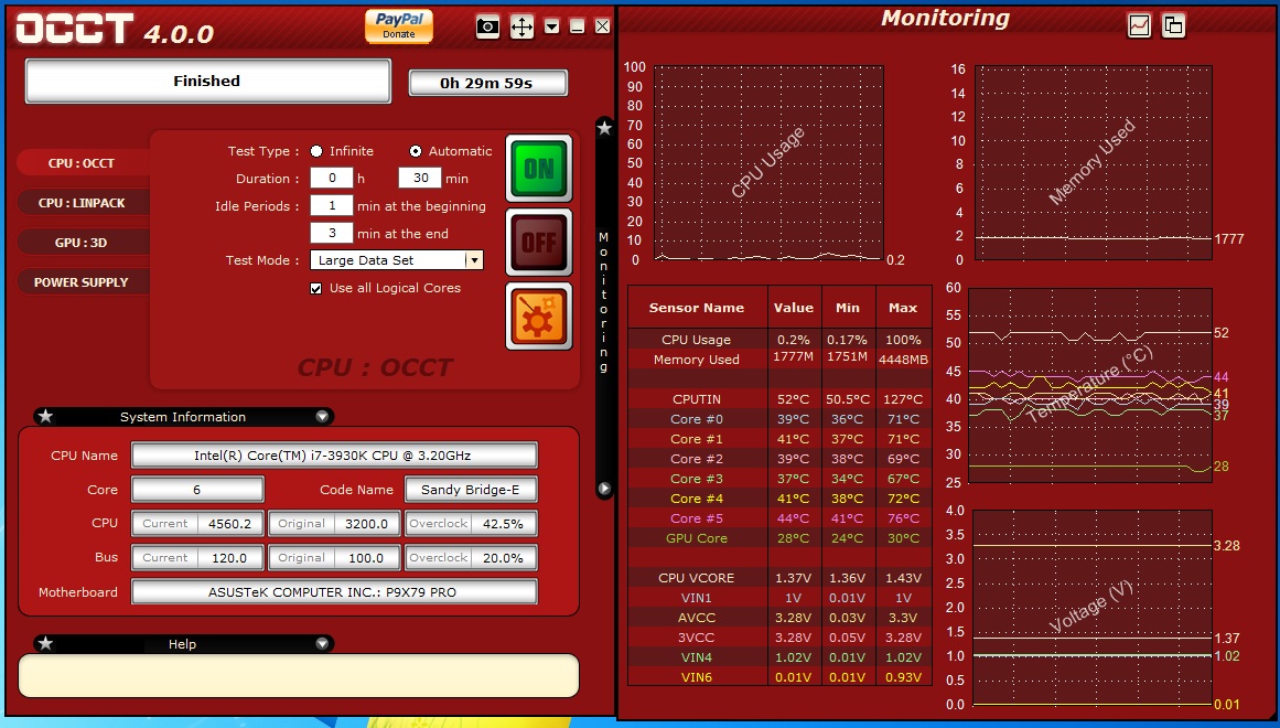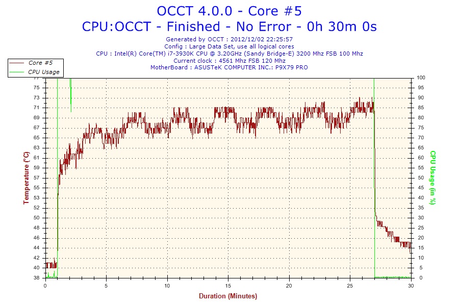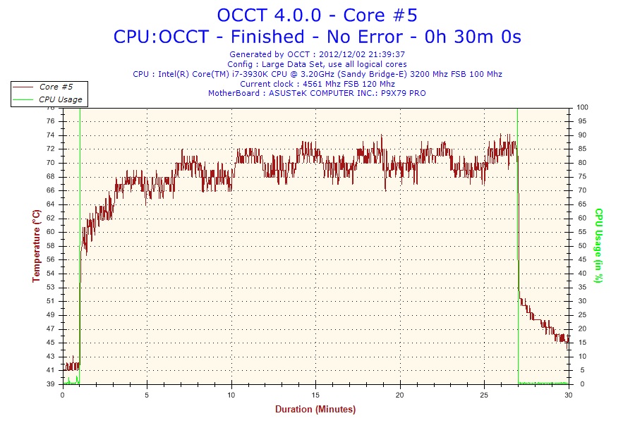 常用しておりますThermaltake BigWater770のラジエータを挟んでケース排気側に固定して、Core i7 3930Kをオーバークロックした状態でOCCTを30分間回して、一番温度の高いコアの温度を比較してみました。(室温は19℃)