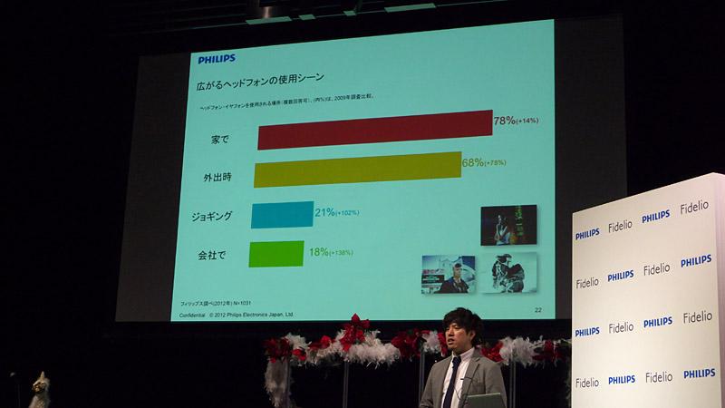 家で使用するほか、ポータブルオーディオの普及により、外出時、ジョギングのほか、会社で使用している率も20%近くに増えているとのこと。