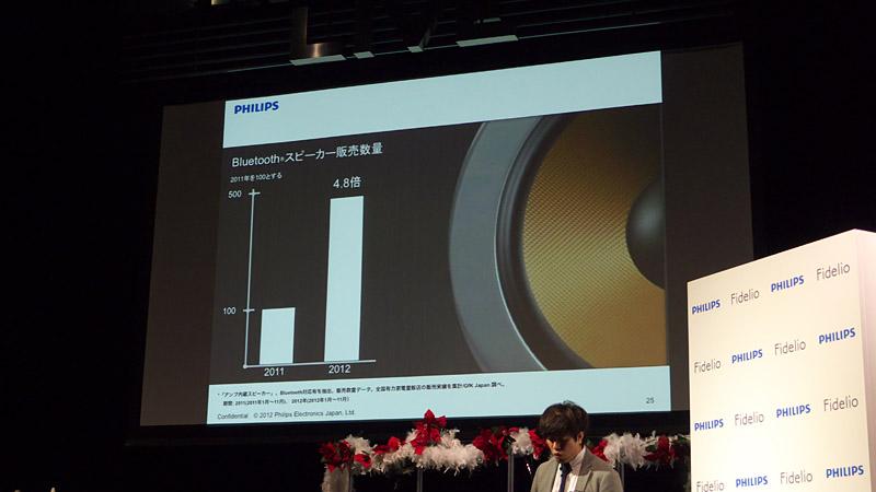 スマートフォンの普及によって、Bluetoothの普及率も格段に増えており、それに伴いBluetooth対応のスピーカーも劇的に販売数が増加しているとのこと。