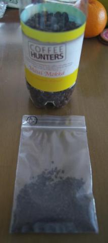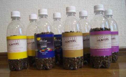 4種類のコーヒー豆がペットボトルに入って各2本ずつ(計8本)が届きました。