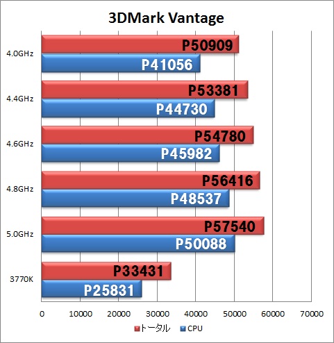 シングルコアの性能では意外にも3790Xの定格と3770Kの定格では同じスコアが出ました。クロックは3790Xが4.0GHzと3770Kが3.7GHzなので3770Kの方が優秀ですが、5.0GHzにOCしての計測では3770Kの方が0.06PTSスコアが高いくらいでした。製造プロセスの違いによる性能差はコア数で補えることが結果から読み取れます。消費電力を考えると22nmのvy Bridgeの方が優秀だと思います。