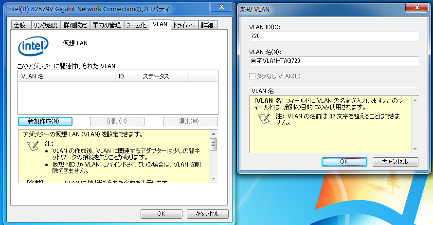 ネットワークアダプターの構成からVLAN設定として,タグIDを定義してあげると自動的に仮想ネットワークインタフェースが作成されます.