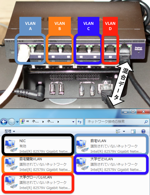 NUCと接続しているポートはタグ付きのVLANデータが流れ,対応しているスイッチングハブでVLANをセットすると上記の図のような接続が可能です.