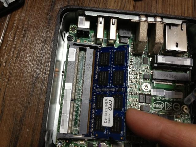 まずはメモリを挿します。 写真のように斜めに入れて下側に押してかとっとロックをかけます。