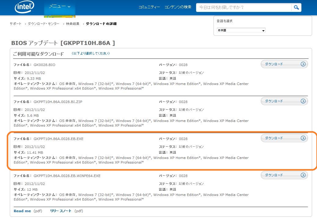 いう情報を頂き、早速ホームページよりBIOSをダウンロードしました φ(..)メモメモ