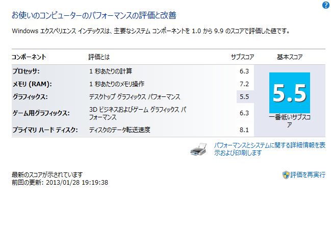 Windowsエクスペリエンスはメモリの数字があまりよくありません。まぁ十分な値ですが。