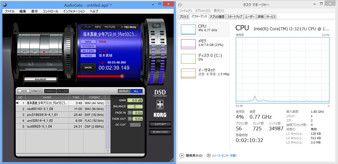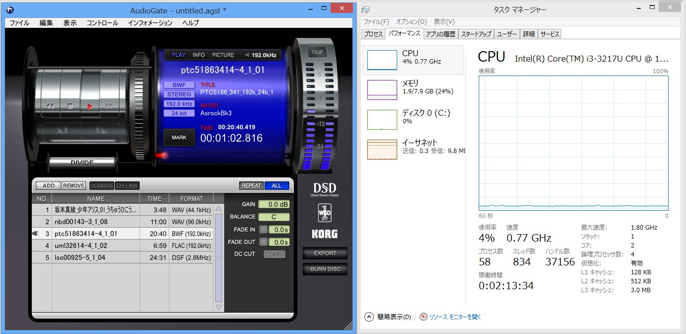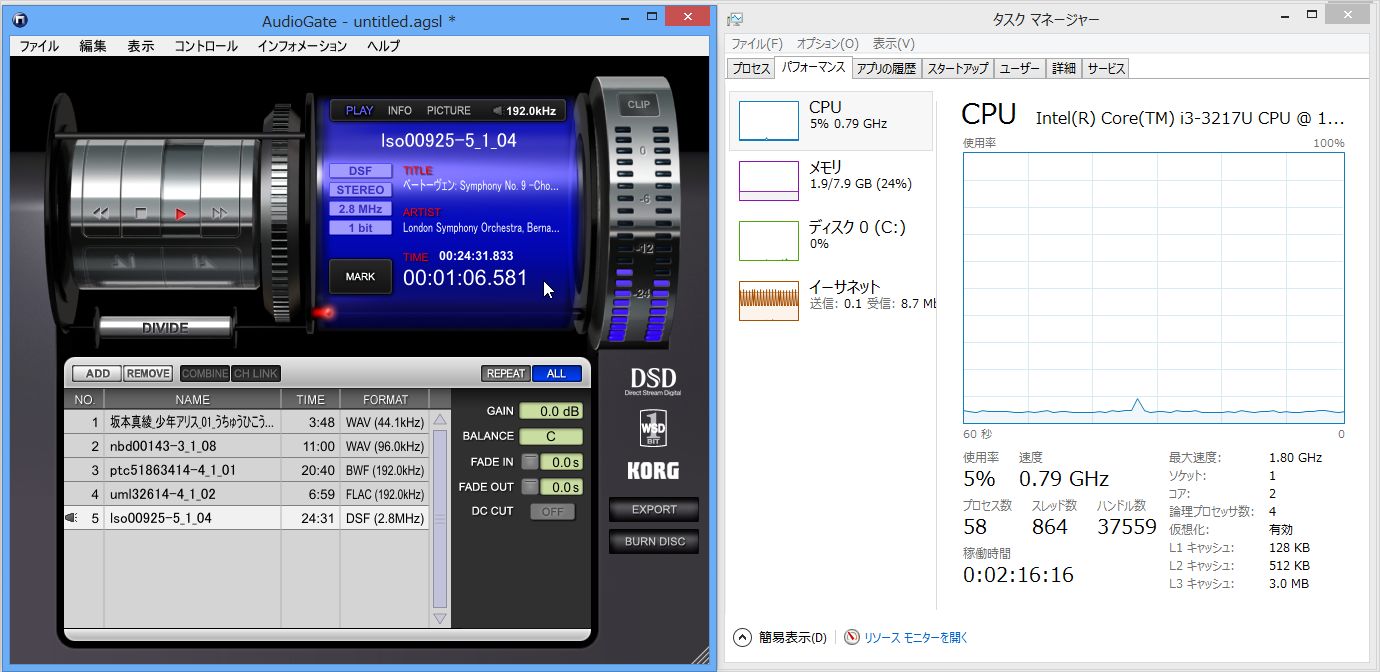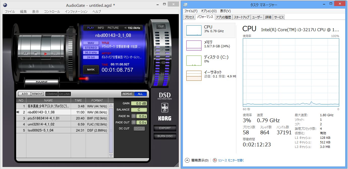 24bit/192kHz音源ですが、CPU負荷はやはりほとんどありません。