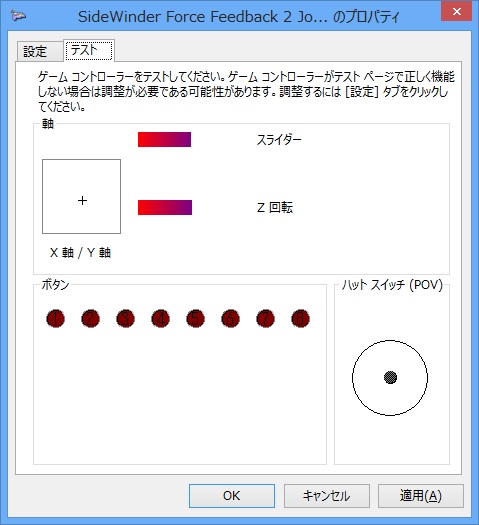 Joystickを選択して 「プロパティ」ボタンを押してプロパティ画面を開く。さっそくテストTabをクリックしてテストしてみる。