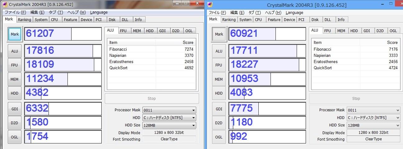 計測にはCrystalMark2004R3を使用した。意外にもほとんどの項目でWindows7の方がスピードが早かったが、大差ないレベルと言えると思う。