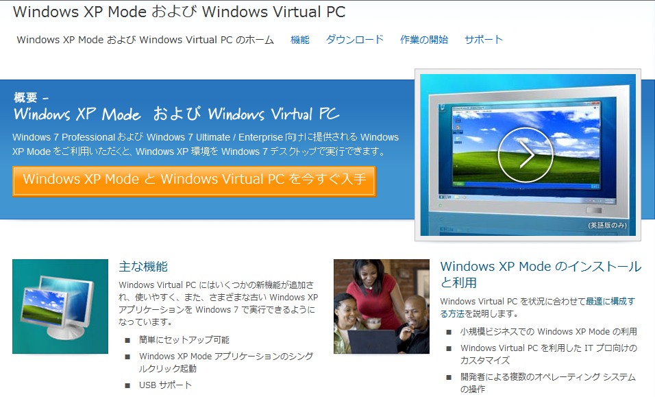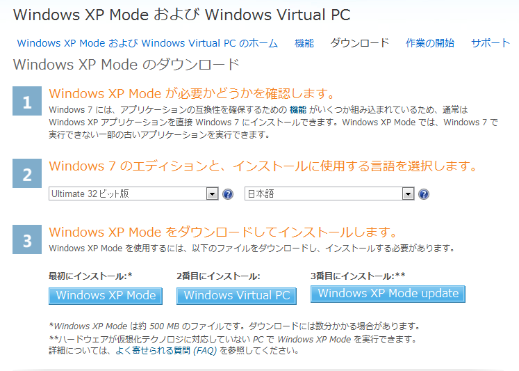 Windows XP Mode および Windows Virtual PC ダウンロードサイト