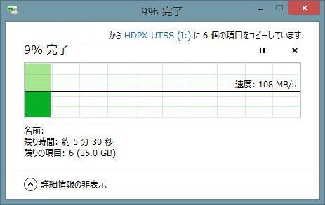 軽くDVD6枚分のDATAをHDDからコピー、35Gのファイルをコピーすることにします HDD(SATA接続) → カクうす9(USB3.0接続) で約5分です 転送速度が108MB/s出てます、これはキャッシュがあると速くて、だんだん遅くなるのがHDDのコピーの常ですが、ほぼこのスピードを維持出来ています、SSDですからね、バッファ必要ないから当然ですか