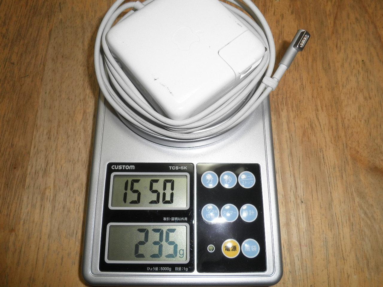 ちなみに、我がMacBookPROのACアダプターは235gですので軽さが分かります