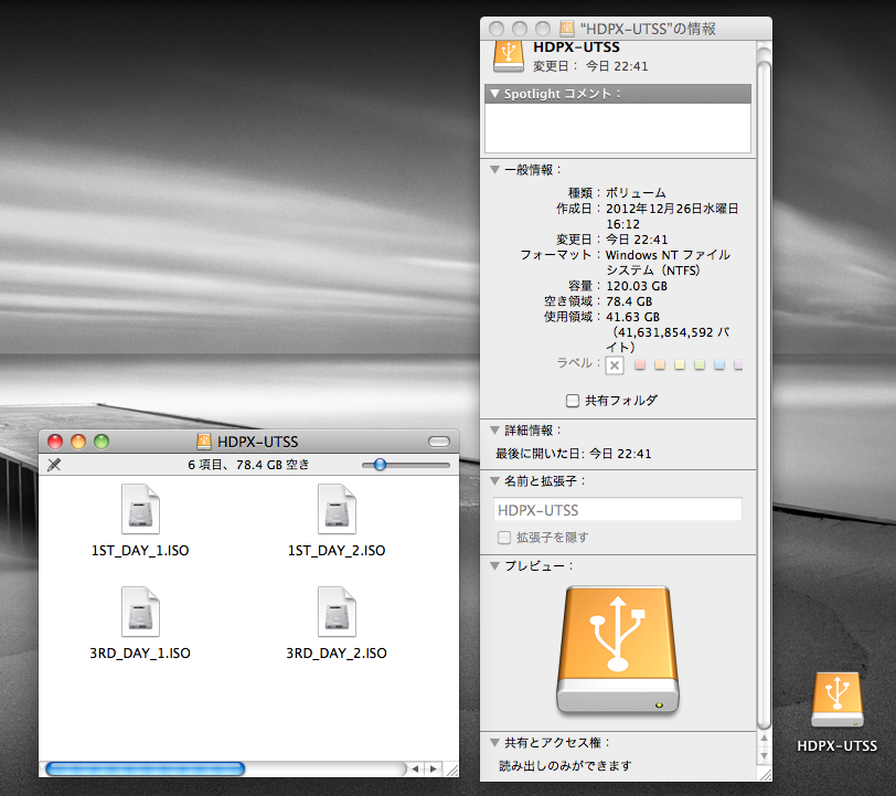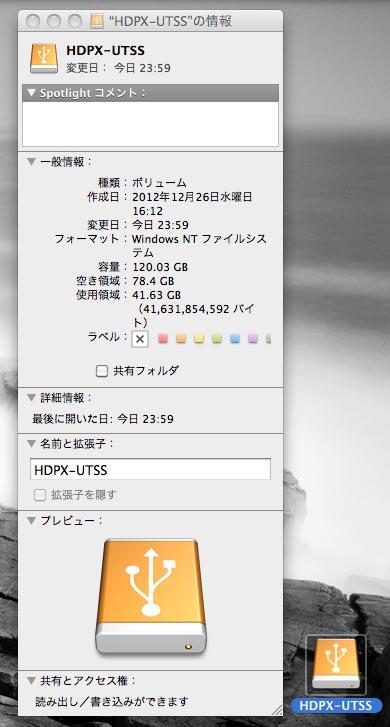 ちなみにこれらのソフトウエアーを導入したあと、共有とアクセス権の所を見ると、読み出し/書き込みができます に変わってます。ちなみにこのMacのスクリーンキャプチャーはカクうす9にMacからコピーしてWindows機で編集しています。このようにNTFSフォーマットでもDATAのやりとり、(書き込み)が出来る用になりました