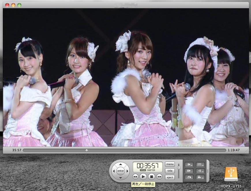 DVDプレーヤーを立ち上げて見ると、HDD同様、ちゃんとマウントされます。もちろん、ちゃんと動きます。駒落ちもありません、私のMacBookPROはUSB3.0をサポートしていないので、USB2.0で動いていますが、全く問題ありません。まずは実験として成功ですね、(下写真)