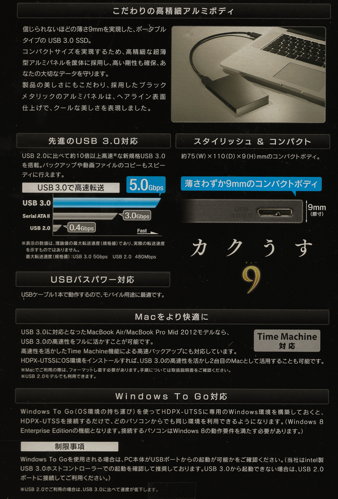 普段から持ち運びで、衝撃やら圧迫やら、良い環境とは呼べない環境なのでポータブルHDDだと不安があった。以前も、衝撃対応なHDDだったけど、許容範囲を超えたようで、読めなくなってしまったポータブルHDがある。それを考えると、大変ありがたい。