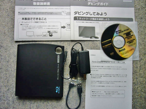 内容物です、取扱説明書、ダビングガイド、 BRP-U6DM2本体、ACアダプタ、USBケーブル、付属ソフトの入ったDVD、付属ソフト「Rocio Creator Premier」の注意書きです。