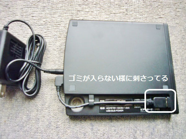 それで、ケーブルを付けてみると、PC側に取り付けるUSBケーブルの端子は本体に差し込む事が出来、未使用時にはゴミが入らない様になってます。