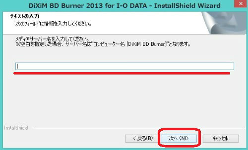 テキスト入力画面ではメディアサーバー名の入力ですが、画面では入力されていませんが、簡単に「2013」にしました、「次へ」をクリックします。