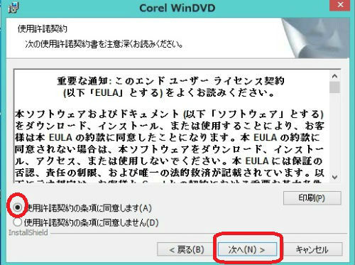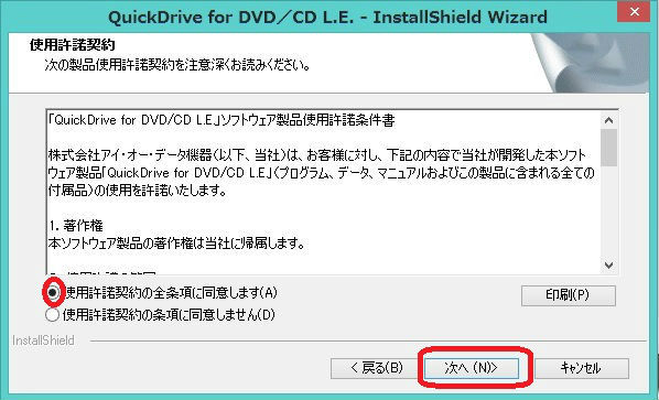 使用許諾契約画面では、「同意します」を指定し、「次へ」をクリックします。